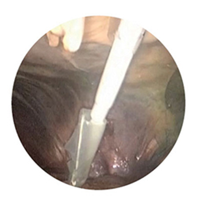 Insert the MemoBag Introducer into trocar* and use the pushing cannula to deploy the MemoBag Tissue Bag into the abdomen.
