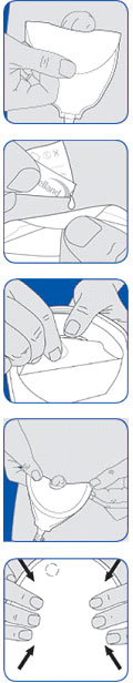Για να τοποθετήσετε τον νέο σάκο βεβαιωθείτε πως το δέρμα σας είναι στεγνό. Για να κάνετε καλύτερη εφαρμογή, διπλώστε στην μέση το κολλητικό υλικό και κεντράρετε την οπή (μισοφέγγαρο) εφαρμόζοντας το αρχικά στο κάτω μέρος της στομίας (όπως στην πρώτη) εικόνα. Το κολλητικό υλικό τοποθετείται πρώτα από την κάτω μεριά της στομίας. Βεβαιωθείτε πως δεν υπάρχουν ζάρες ανάμεσα στο δέρμα και το αυτοκόλλητο (αν υπάρχουν τεντώστε το δέρμα).