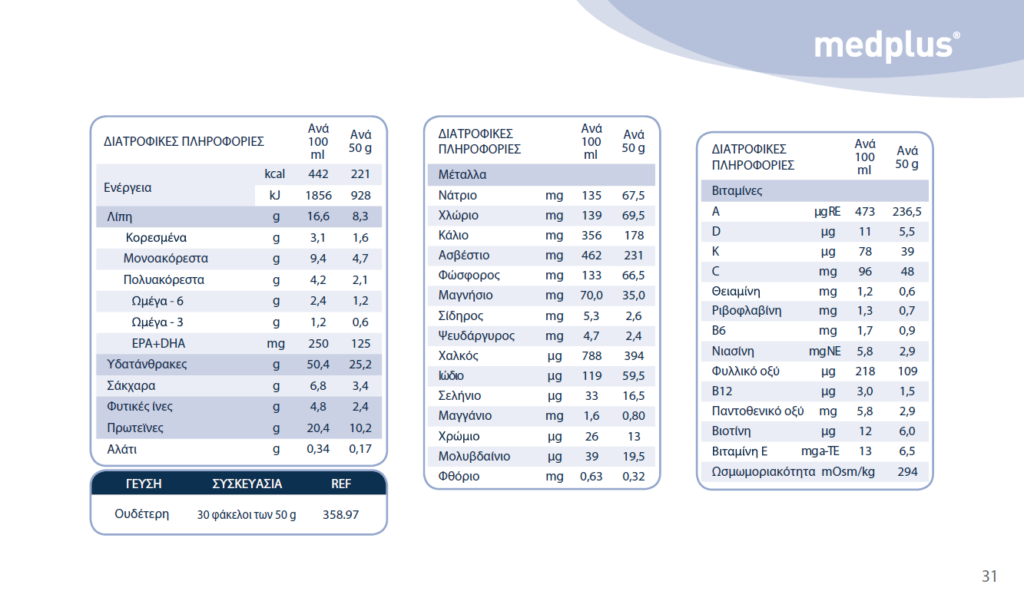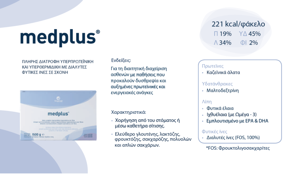 Πλήρης υπερπρωτεϊνική και υπερθερμιδική διατροφή σε σκόνη με 100% διαλυτές φυτικές ίνες (φρουκτολιγοσακχαρίτες) με πρεβιοτική δράση. Για την διαιτητική διαχείριση ασθενών με δυσθρεψία λόγω υποκείμενης νόσου και ιδιαίτερα αυξημένες πρωτεϊνικές και/ή ενεργειακές ανάγκες. Σε ατομικούς φακέλους των 50γρ.