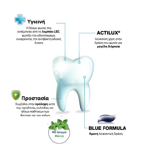 Οι μικροκρύσταλλοι που περιέχει το Actilux δεσμεύονται στο σμάλτο του δοντιού μετά από κάθε βούρτσισμα. Με κάθε χαμόγελο, το φως ενεργοποιεί τους μικροκρυστάλλους του Actilux, κάνοντας τα δόντια σας πιο λευκά, προστατεύοντας τα ταυτόχρονα από τερηδόνα ουλίτιδα και άλλες παθήσεις των δοντιών και των ούλων.